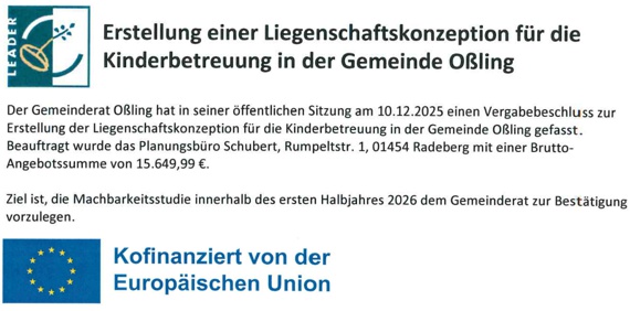 Neue Rubrik "Bericht des Bürgermeisters" Neue Satzungen und Richtlinien der Gemeinde Oßling Neugestaltung der Seite "Kindertagesstätte Knirpsenland" Bauen / Wohnungsangebote Tipps der Verbraucherzentrale / Energieagentur Bürgergespräch mit Landrat Udo Witschas am 26.02.2026 im Ortsteil Döbra der Gemeinde Oßling![]() Bürgermeisterfrühstück in Bautzen![]() ![]() Arbeitskarte: Vermessung Schwarze Elster (OT Milstrich)(PDF-Datei)![]() ![]() ![]() ![]() ![]() Bericht 2025 des Bürgermeisters der Gemeinde Oßling(PDF-Datei)![]() ![]() ![]() ![]() ![]() Bus-Umleitungsfahrplan Linie 534 ab 26.11.25(PDF-Datei)![]() Integriertes Gemeindeentwicklungskonzept (INGEK)(PDF-Datei)![]() ![]() Nachrichten zur Oberlausitzer Heide- und Teichlandschaft (OHTL):Regionalmanagement: http://www.ohtl.de Tourismusentwicklung: http://www.oberlausitz-heide.de OHTL Newsletter 11 / 2025